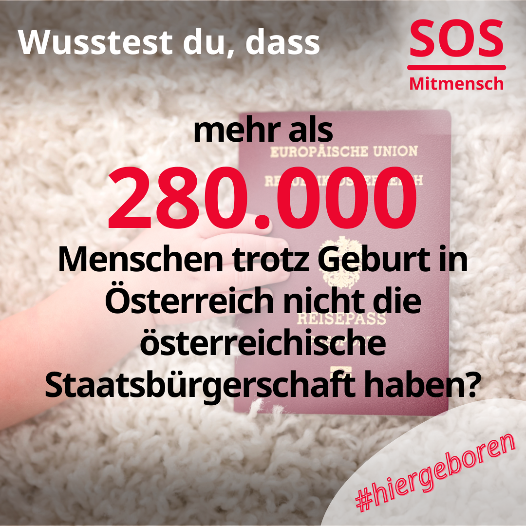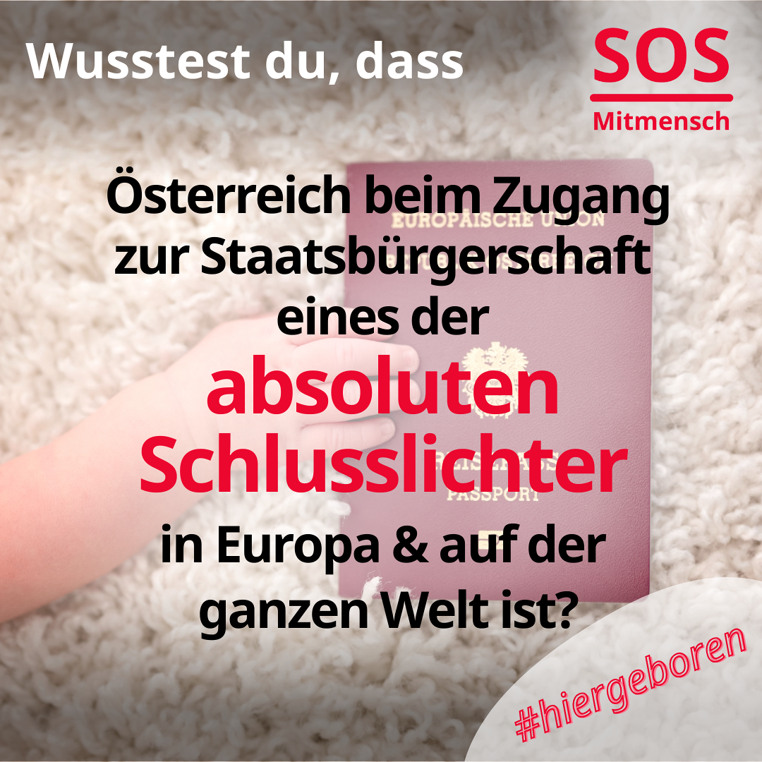 Das muss sich dringend ändern! Diese Ausgrenzung tut den Betroffenen nicht gut und sie tut Österreich nicht gut! Deshalb hat SOS Mitmensch Anfang 2021 die #hiergeboren-Kampagne ins Leben gerufen. Wir setzen uns für einen fairen Zugang zur Staatsbürgerschaft ein!