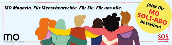 Mit der Bestellung eines MO-Soli-Abos tragen Sie wesentlich dazu bei, auch in Zukunft die Realisierung unseres Menschenrechtsmagazins, das sich durch unabhängige und qualitätsvolle Berichterstattung zu Menschenrechtsthemen auszeichnet, zu ermöglichen. Vielen Dank!